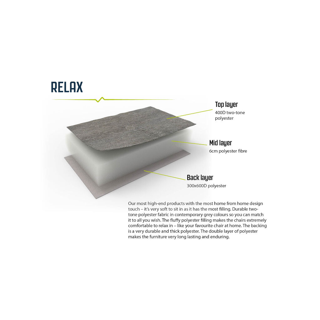 Campingsoffa i hög kvalitet där man satsat extra på komforten. Tjockare stoppning och tyg med förstärkta hörn, gör tillsammans med den slitstarka stålramen att det här är en campingsoffa man kan njuta av under lång tid.