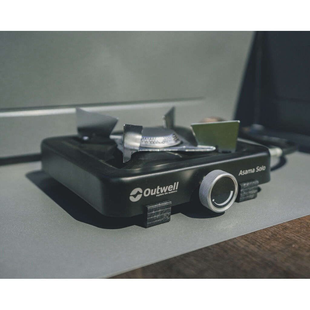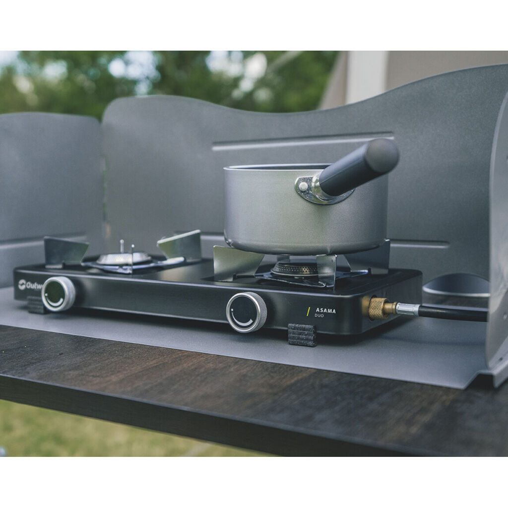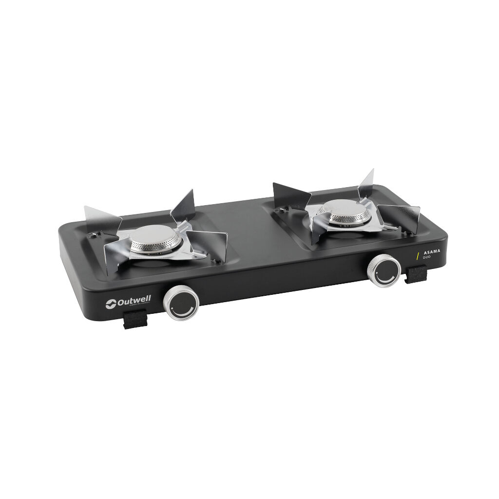 Campingspis för engångsflaskor med två brännare på 2x3000W. Fötter med bra grepp gör att spisen står stabilt och den låga profilen gör den mycket packvänlig.