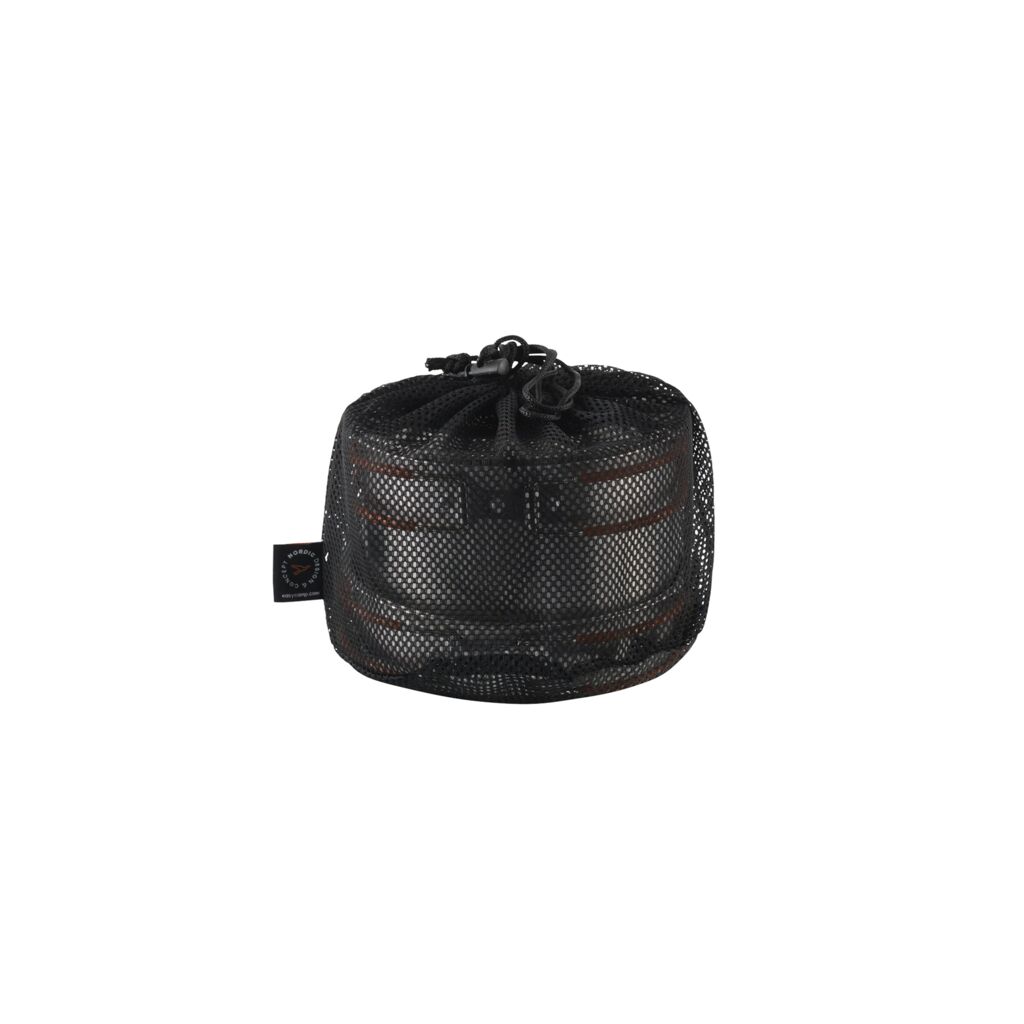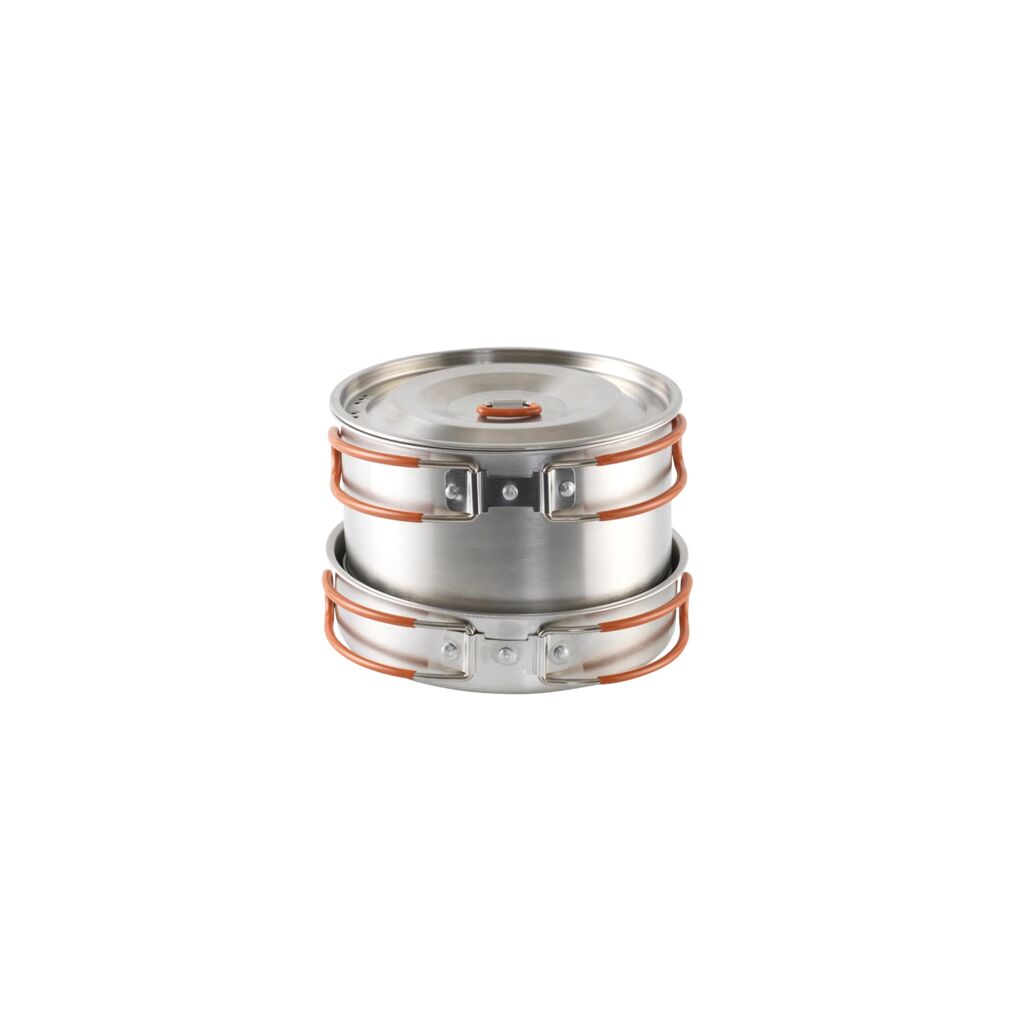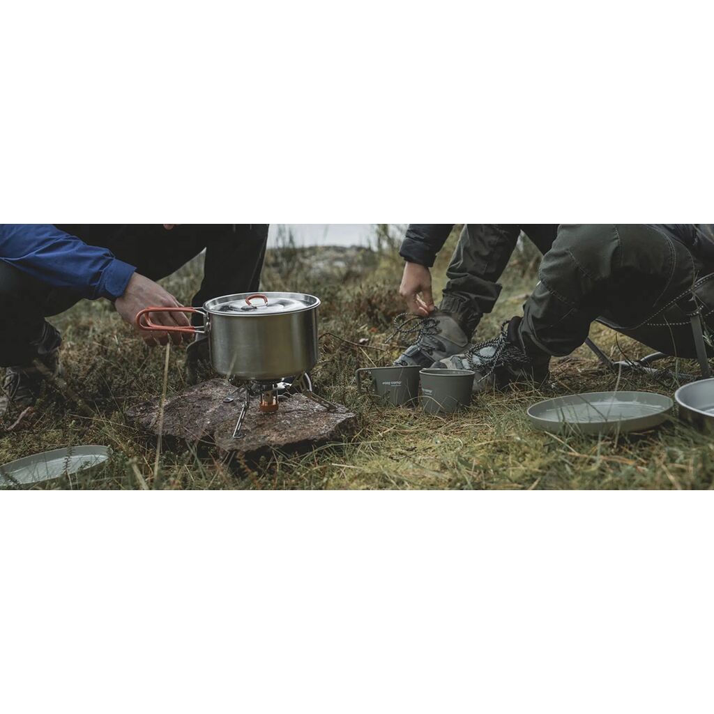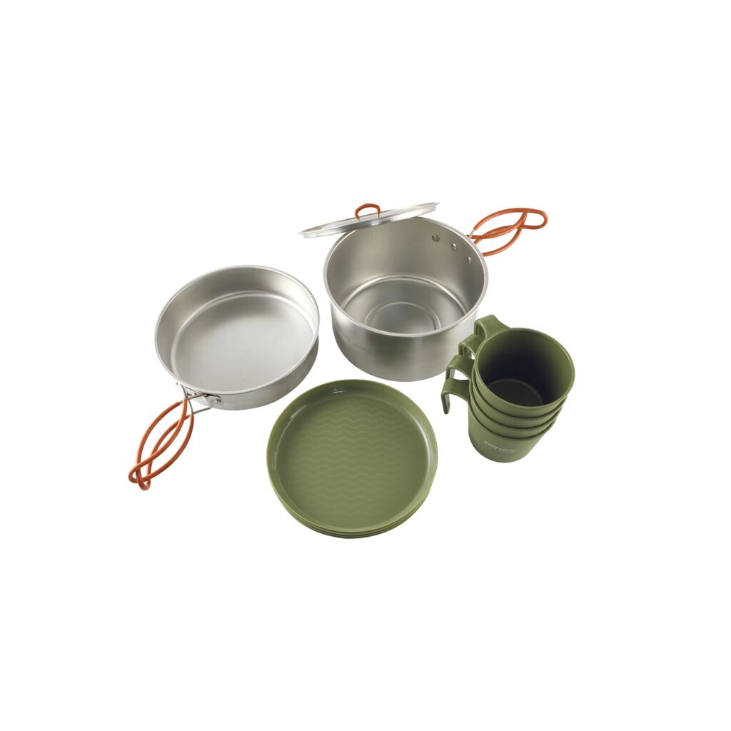 Set med muggar och tallrikar för 4 personer samt en 3-litersgryta med lock och en stekpanna. Setet är stapelbart och det medföljer en nätpåse för förvaring.
