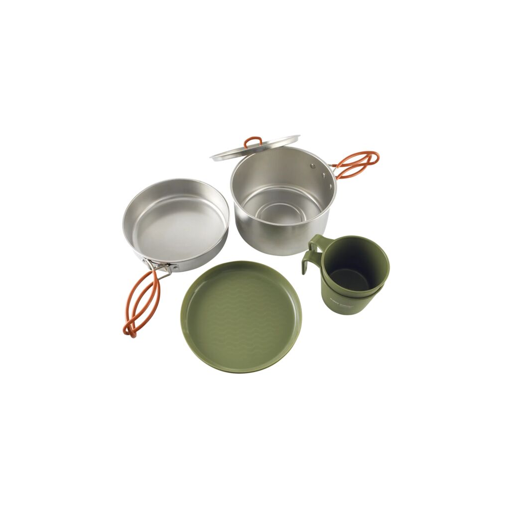 Set med muggar och tallrikar för 2 personer samt en 2-litersgryta med lock och en stekpanna. Setet är stapelbart och det medföljer en nätpåse för förvaring.