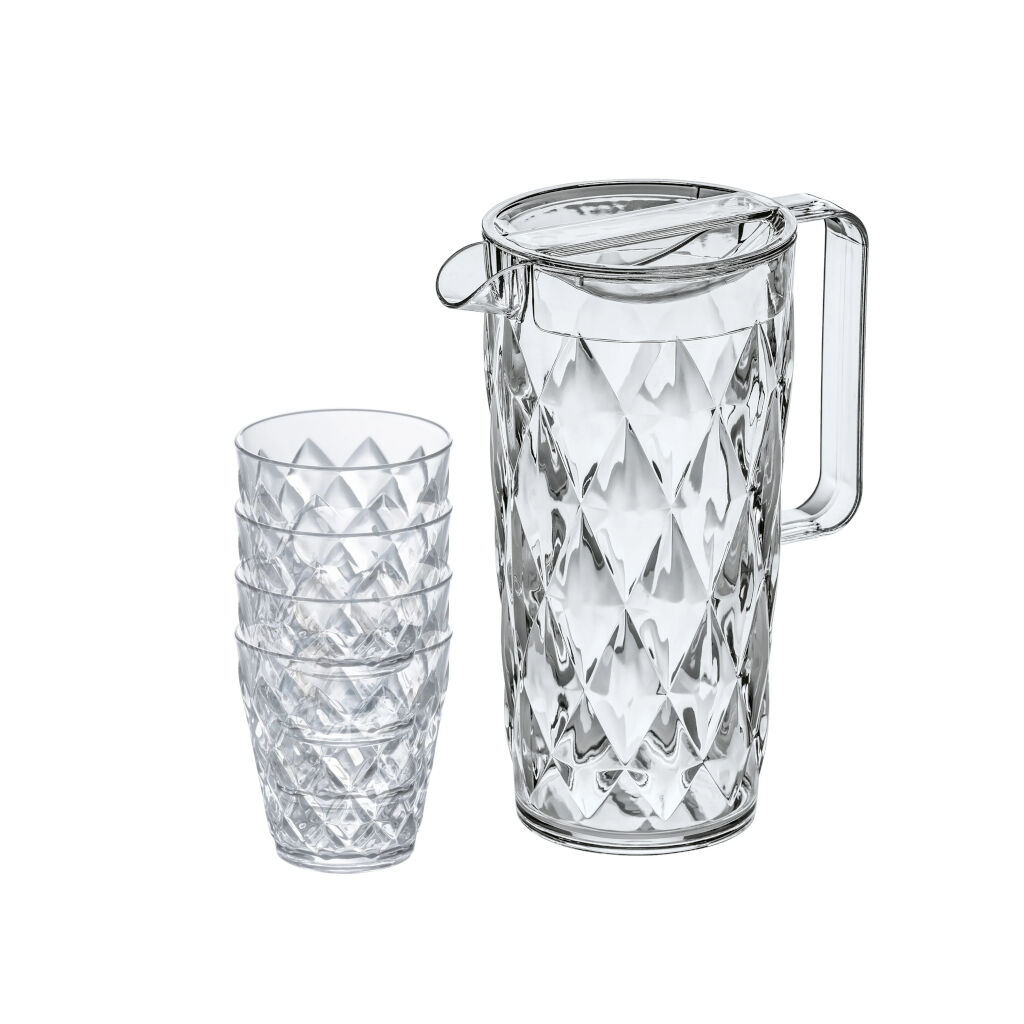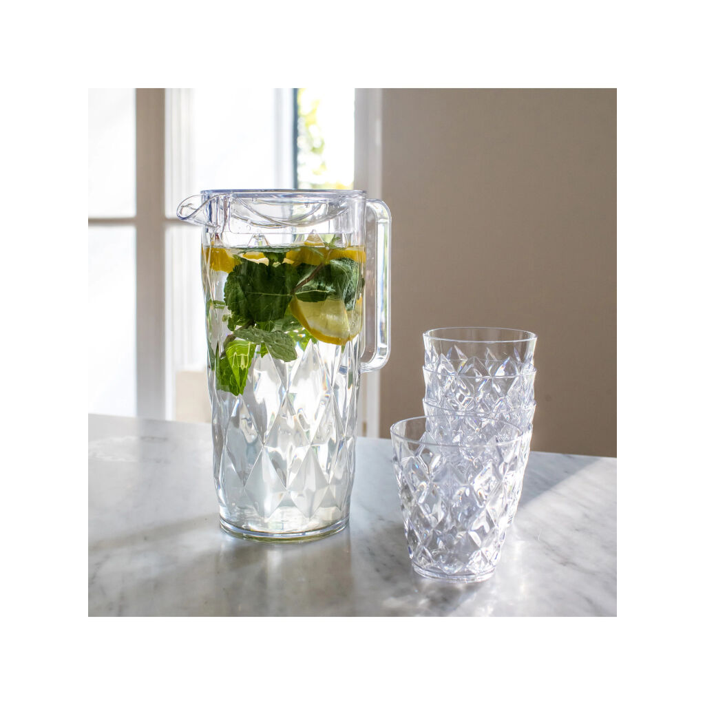 Modern karaff på 1,6 L tillverkad av okrossbart plastmaterial som ser ut som vanligt glas. Den är återanvändbar och 100% återvinningsbar. Karaffen bidrar även till en säkrare miljö genom att eliminera risken för trasigt glas. 4 glas i matchande design ingår med en volym på 220 ml/st. Glasen är gjord av samma eco-vänliga material och perfekt lämpade för campinglivet!