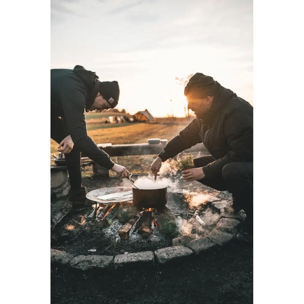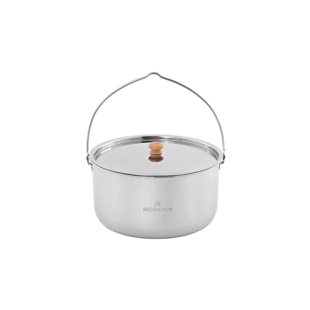 Laga mat över öppen eld med denna 6-liters gryta i rostfritt stål från Robens. Handtag med fästpunkt för upphängning över eld samt en knopp på locket i trä för enklare hantering.