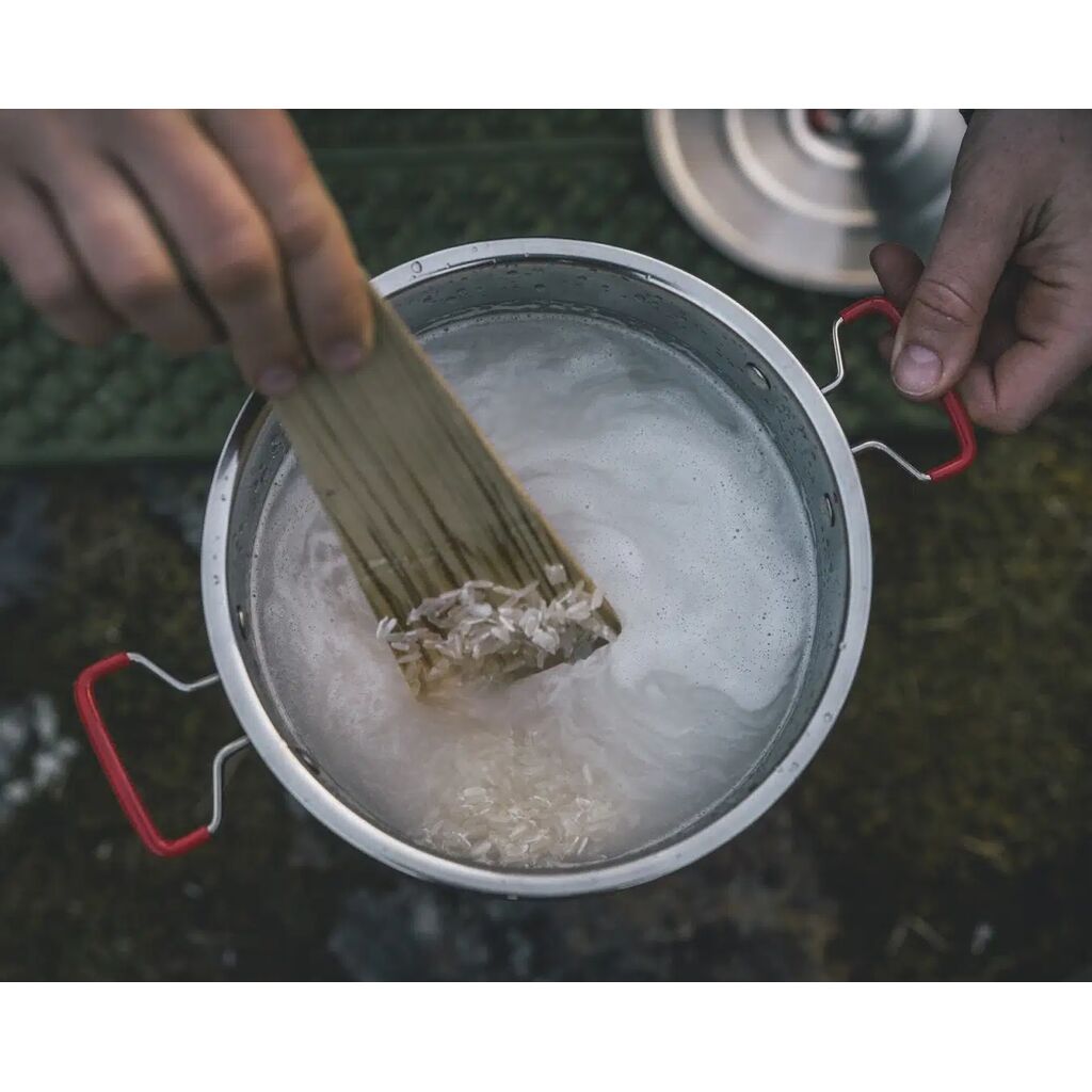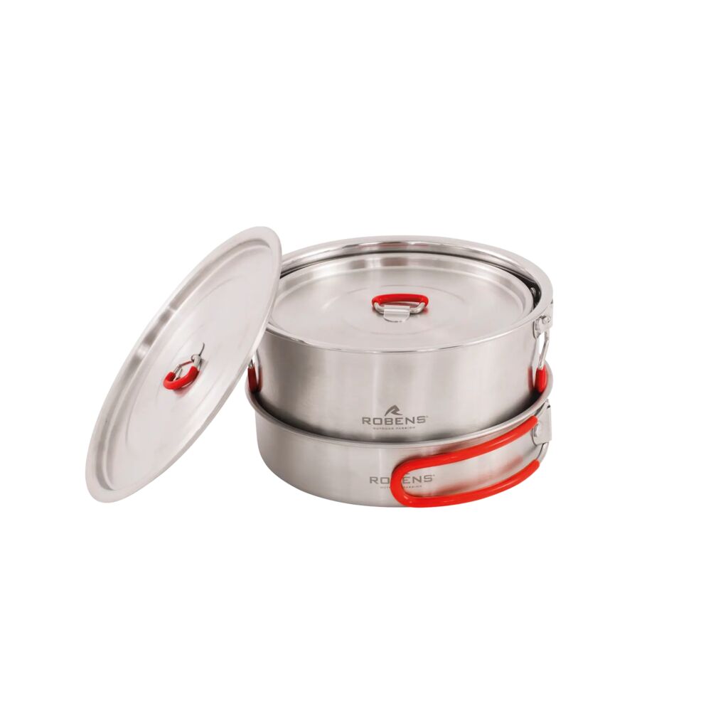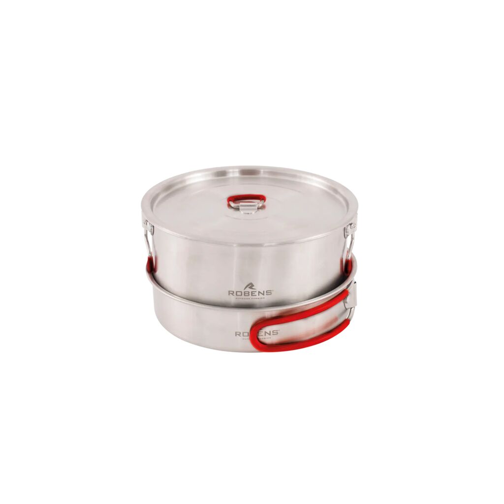 Ett praktiskt och högkvalitativt kit från Robens för matlagning på campingköket. Handtag i rostfritt stål med silikonöverdrag och kastruller som är reptåliga och värmebeständiga.