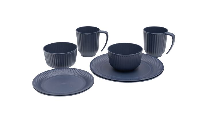 Setet inkluderar tallrikar, skålar och muggar för två personer – allt i en elegant marinblå design.