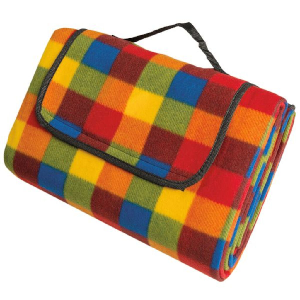 Mjuk picknickfilt i fleece med vattentät undersida.