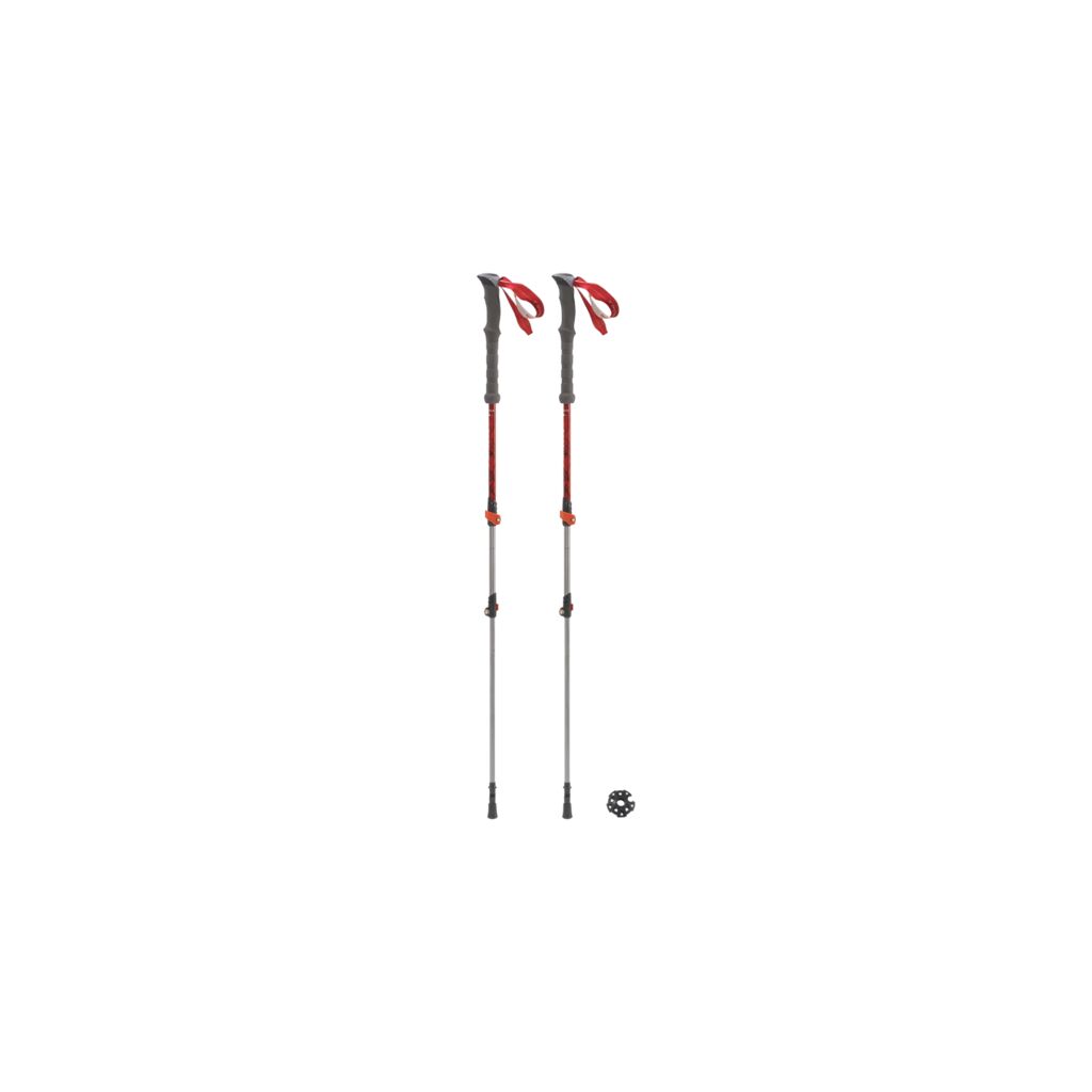 Teleskopiska vandringsstavar i aluminium med fjädring (antishocksystem). Antishocksystemet är enkelt att koppla på och av genom att vrida på stavens övre del och består av en fjäderlösning på toppstycket som ger en mjukare belastning vid längre vandringar. Staven har extra långa handtag för att kunna variera greppet efter terrängen. Spets nedtill vilket ger bra grepp. Klykorna går att byta ut.