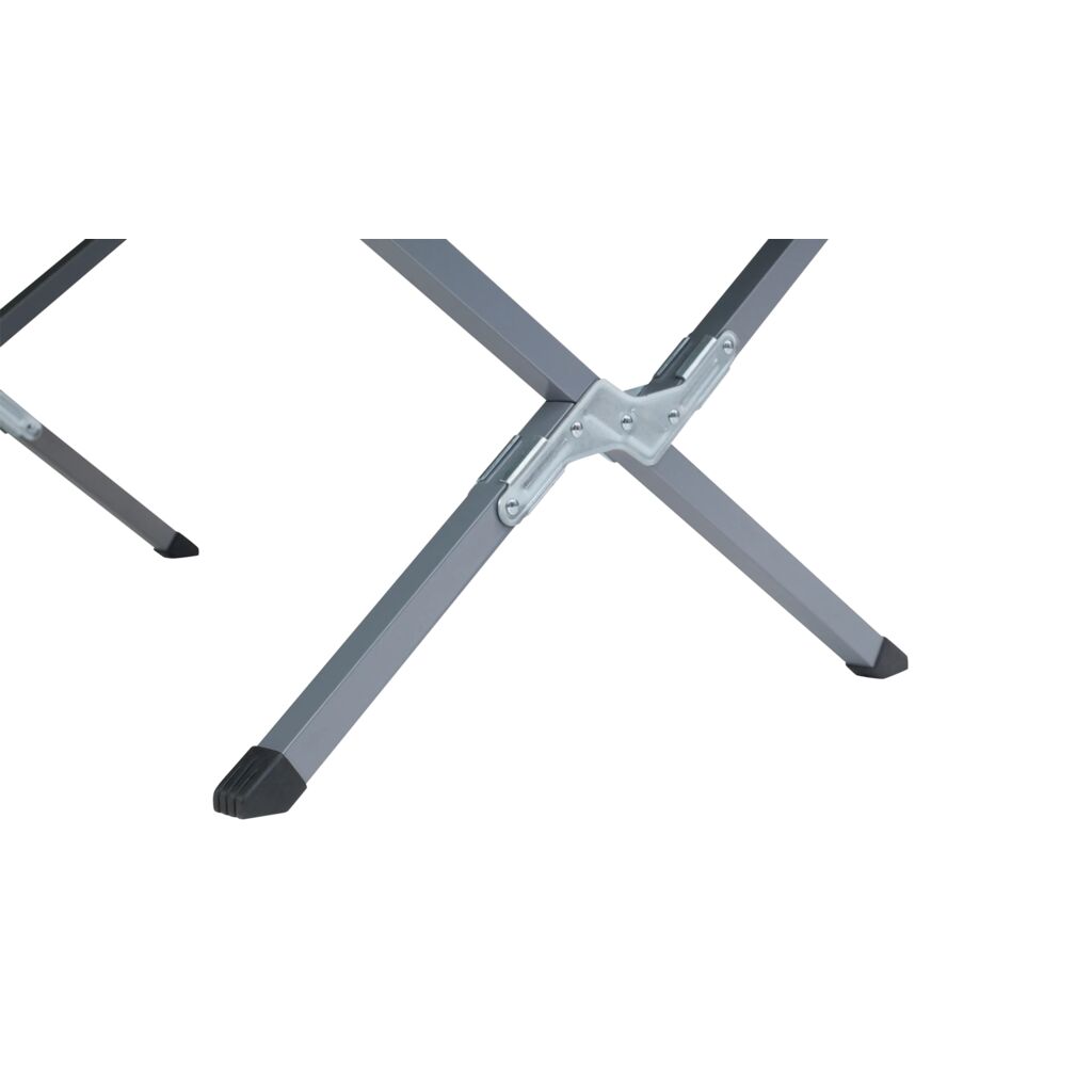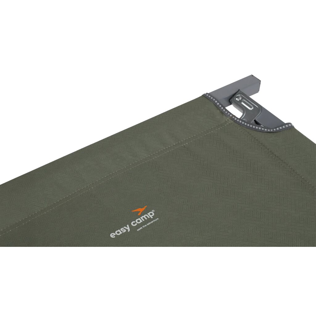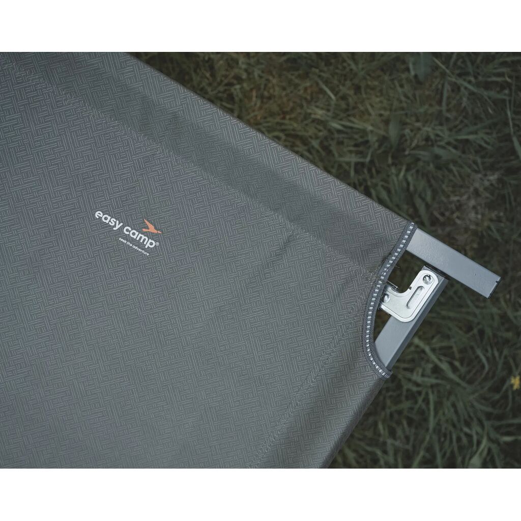 Robust hopfällbar säng med stålram, bädd i kraftig polyester, och en höjd på 39 cm.