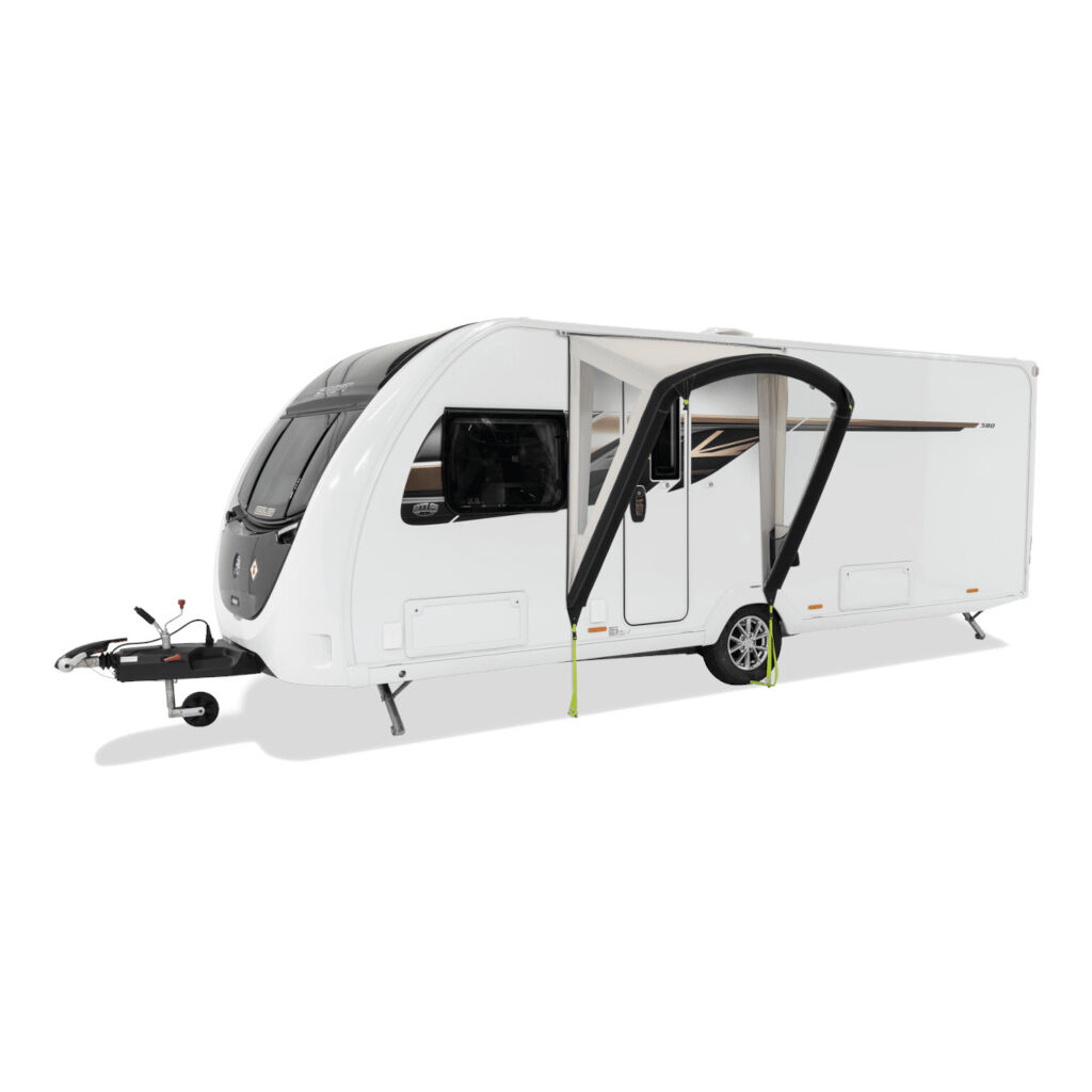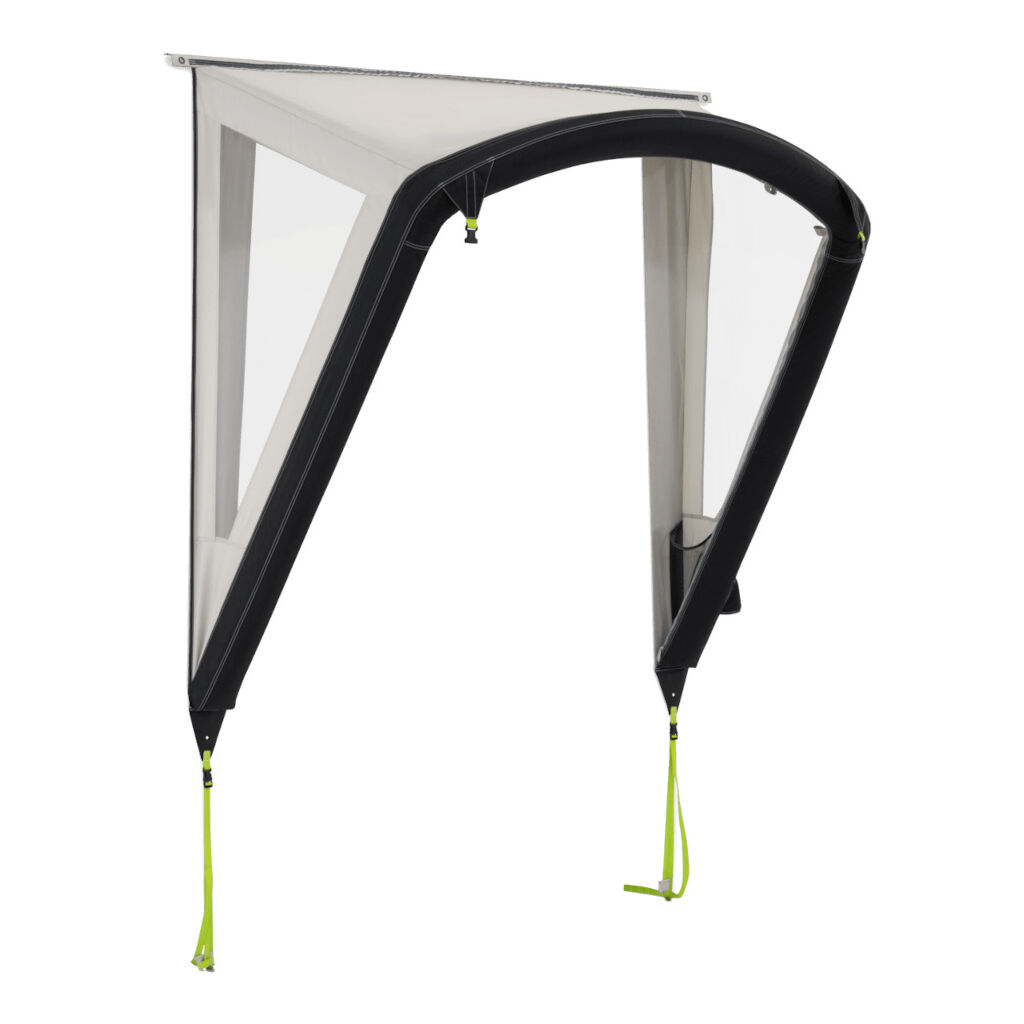 Dometic Portico AIR är en lättmonterad markisdörr som ger dig en skyddad in- och utgång till husvagnen. Pumpas upp via en ventil och installeras enkelt via husvagnslisten och förankras till marken med de inkluderande markpinnarna.