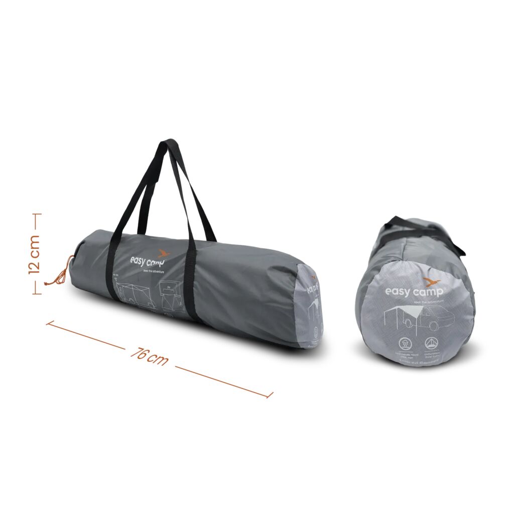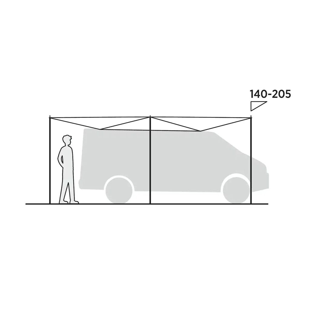 Markis för vans, husvagn och mindre husbilar, som består av tre trekantiga paneler och tre stänger som går att justera i höjd. Panelerna kan dras ihop på flera olika sätt beroende på vilken skugga eller skydd man önskar.