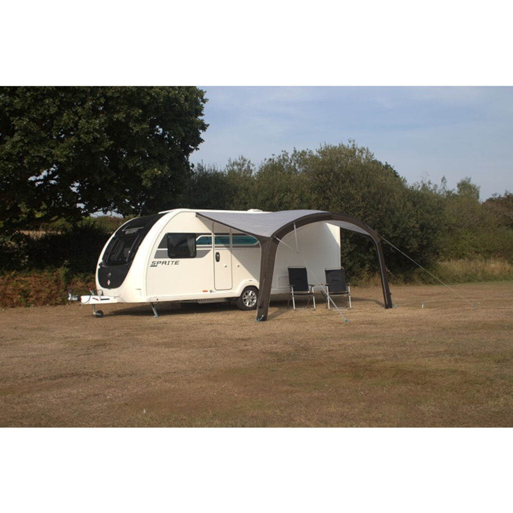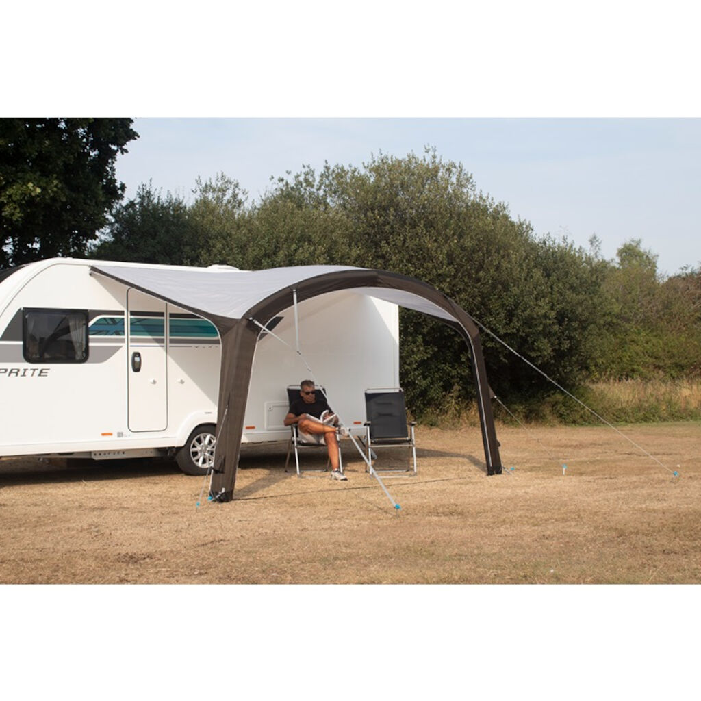 Lättmonterat soltaket som med integrerade luftkanaler enkelt pumpas upp. Fäst duken i listen på husvagnen, pumpa up kanalen och fäst markpinnar och stormlinor och så är ni redo för avkoppling. En tålig polyesterduk gör det lätt men samtidigt motstångskraftigt mot väder och vind.