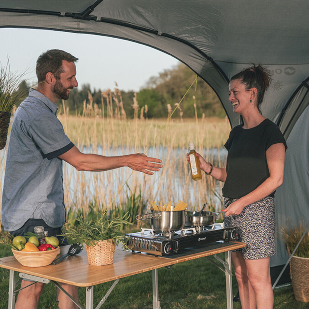 Outwell Event Lounge är ett lättrest trädgårdstält som snabbt ger en sol- och regnskyddad yta att äta eller umgås under.