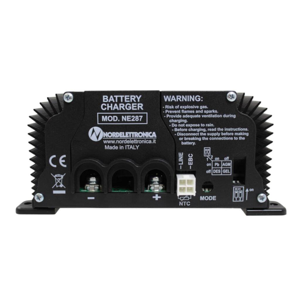 Nordelettronica NE287-21A är en 12V batteriladdare som ger upp till 21A ström, perfekt för husbilar och husvagnar. Den laddar bly- och litiumbatterier med en smart 3-stegs algoritm och har säkerhetsskydd mot överström och överhettning. Du kan enkelt ställa in rätt laddningsprofil med dip-switchar, och en temperatursensor kan justera laddningen för bästa resultat. Laddaren kan också användas som strömförsörjning och passar batterier på 130–210Ah.