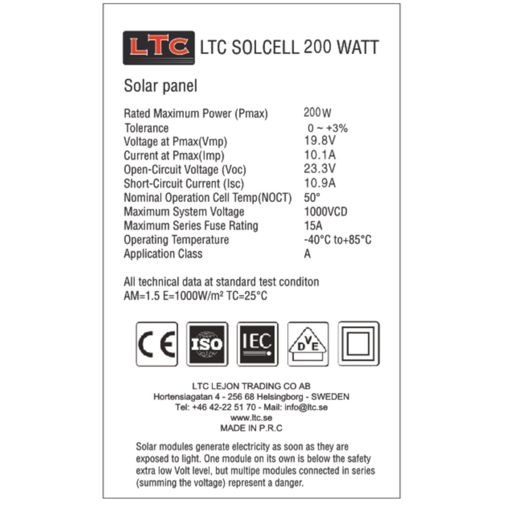 200W solpanel från Svenska LTC. Tack vare effektiva 5bb cellerna har panelen en högre effekt på mindre yta. Framtagen för att klara av klimatet i norden och har därför ett temperaturområde på -25°C till +80°C.