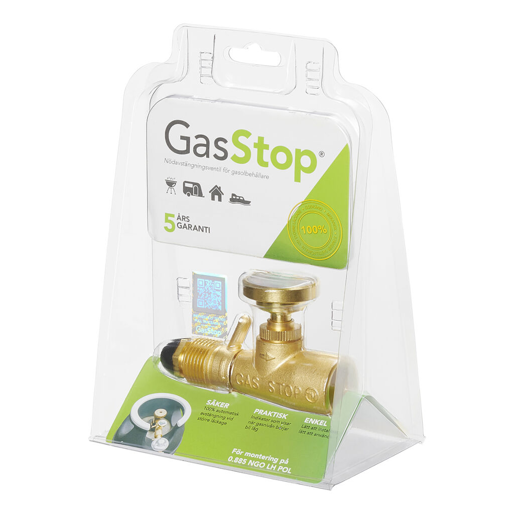 GasStop är en 100 % automatisk nödavstängningsventil för gasflaskor. Den stänger omedelbart av gastillförseln vid större läckor och har en praktisk gasnivåmätare. Enkel att installera och använda, med 5 års garanti.