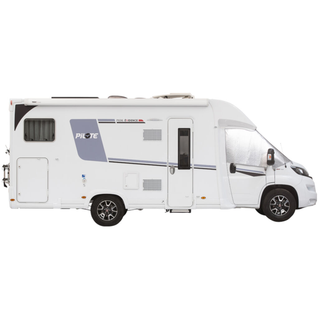 Isolerande fönstermatta anpassad för husbilar. På vintern isolerar den mot kyla och under sommaren stänger den ute soljus och håller värmen nere. Monteras över dörrarna på husbilen samt med elastiska band ned mot skärmen och framtill.