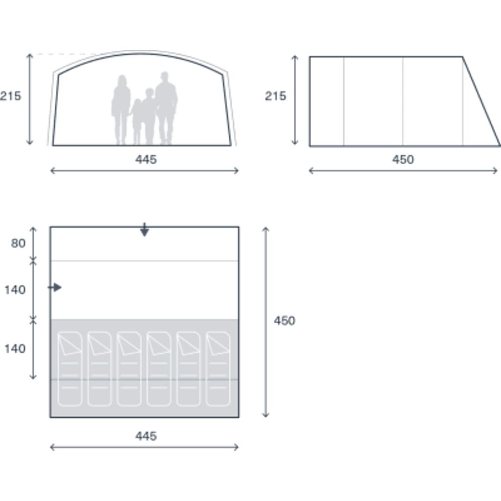 Upptäck ett rymligt familjetält med tre sovrum, ett ljust och luftigt allrum samt en skyddad entré framtill. Det fastsydda golvet i allrummet ger ett behagligt klimat genom att skydda mot drag, fukt och småkryp – perfekt för måltider och umgänge. Den mörka sovkabinen ger bättre sömn och kan enkelt anpassas med en avtagbar mellanvägg, så att ni kan välja mellan separata sovrum eller ett större gemensamt utrymme. Ett utmärkt val för den större familjen eller för dig som vill ha ett extra rymligt och prisvärt campingtält.