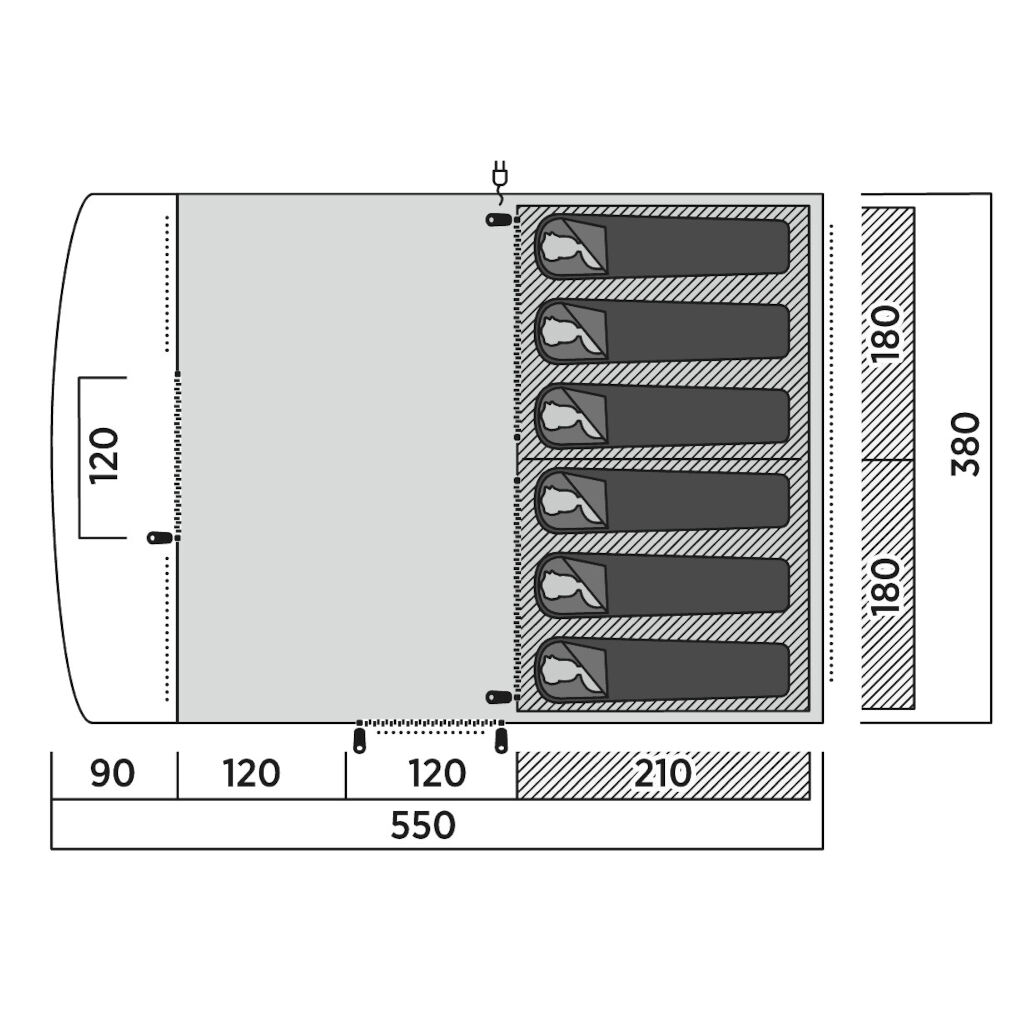 Allrummet är rymligt och dess stora fönster ger en ljus och trevlig miljö så det är inga problem att möblera det för att äta och umgås i tältet kyligare kvällar och regniga dagar. Tältets fönster är dessutom utrustade med hoprullningsbara gardiner som kan fästas i tre olika nivåer vilket gör det enkelt välja hur mycket ljus eller insyn man vill ha. En stor fördel med Palmdale 600 är att tältet kommer med en fast golv, det vill säga att golvet sitter fast i yttertältet, vilket skyddar mot väta, kalldrag och småkryp. En lösning som ger stor skillnad i komforten speciellt under kvällar och kallare dagar.