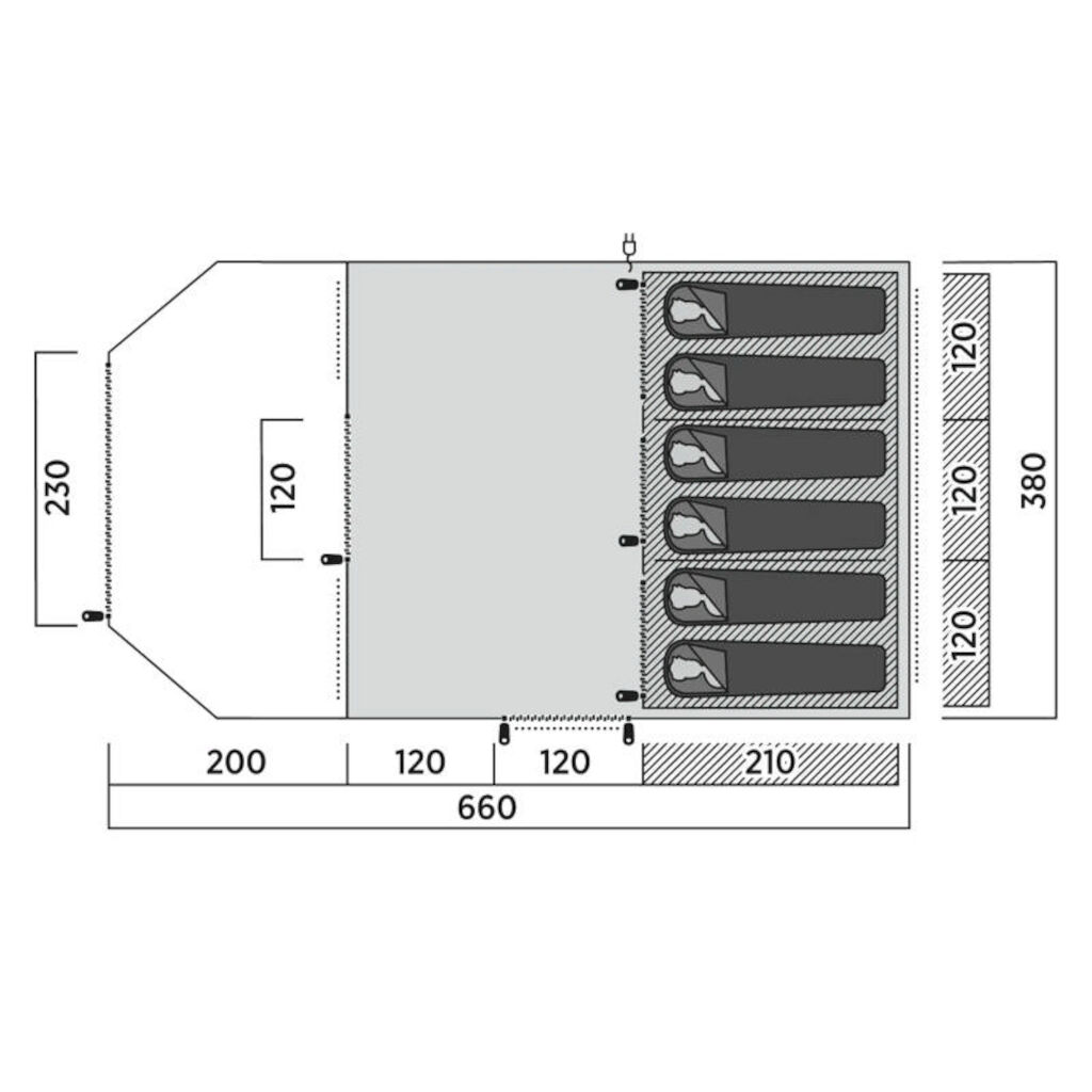 En större version av vår storsäljare bland familjetält. Ett 6-personerstält med fastsytt golv, ett rymligt allrum med stora fönster, två sovrum samt ett extra rum i fronten. Det extra rummet passar även som en skyddad uteplats ifall dörren fäst upp eller till att förvara cyklar, barnvagnen eller annan utrustning i.