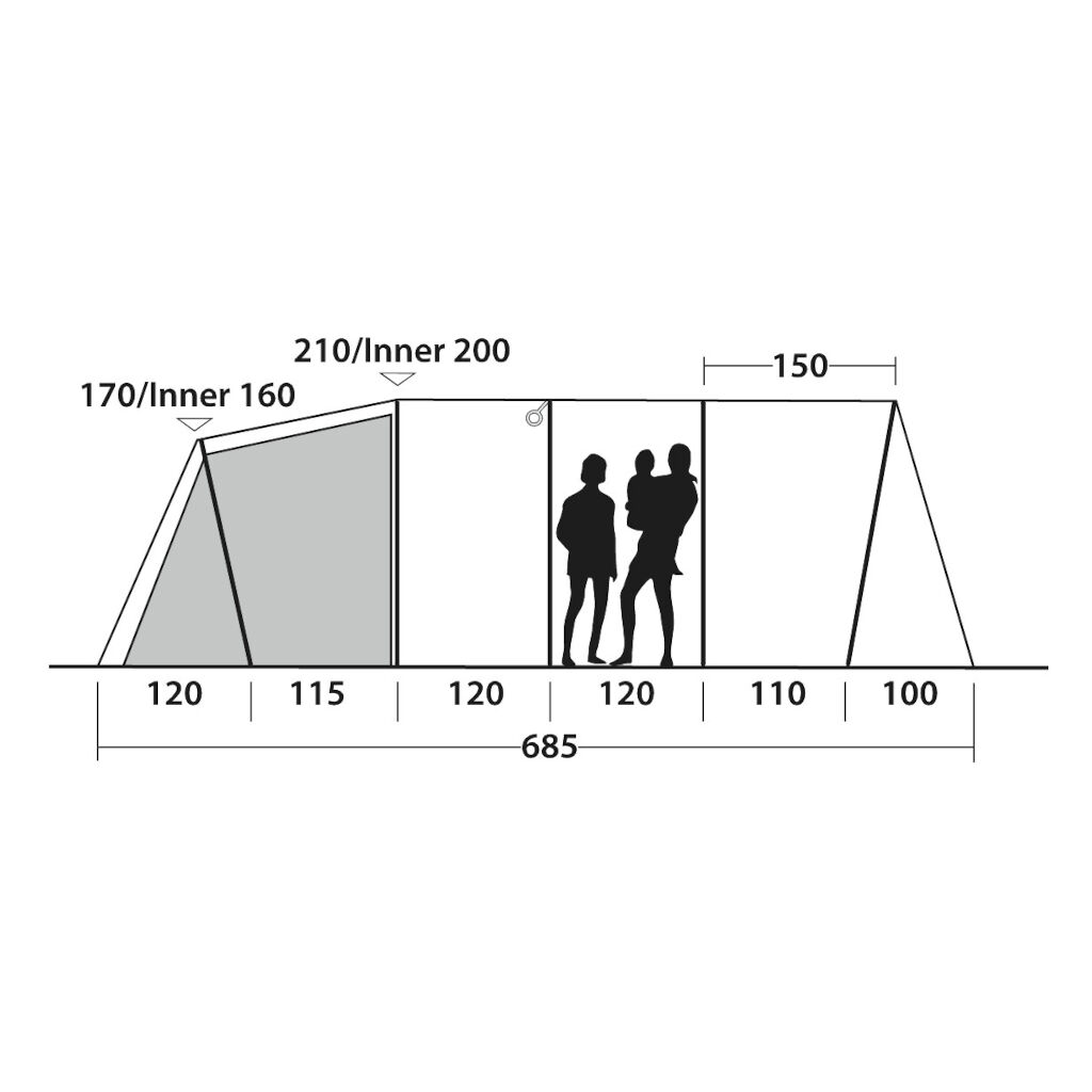 Outwell Carolina 6 är ett rymligt tresons-tält, perfekt för längre familjesemestrar. Det stora vardagsrummet erbjuder gott om utrymme för avkoppling, matlagning och middagar. Tältet har tre mörklagda sovrum med bra ventilation, medan väggen i den tredje zonen har nätfönster med uppfällbara gardiner. Dessutom kan den stora våtzonen användas för förvaring eller som en skyddad ingång vid dåligt väder.