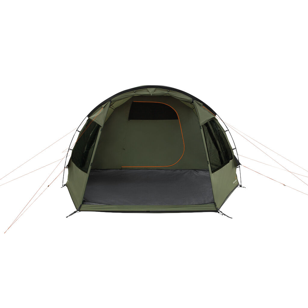 Easy Camp Kinn 5 är ett stabilt kupoltält med stort förtält, två dörrar och ett avtagbart golv för flexibilitet. Fönster på båda sidor med gardiner ger ljus och avskildhet, medan ventilation fram och upptill skapar ett behagligt inomhusklimat.