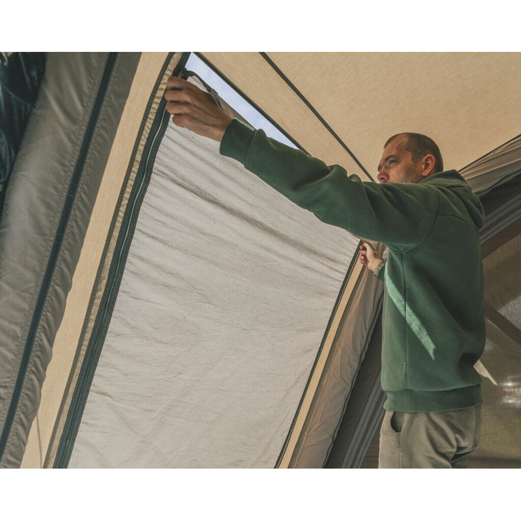 Den boxiga designen och de formade luftkanalerna ger generös takhöjd och bättre rörelsefrihet. Tonade fönster och flexibla gardiner minskar värme och insyn, medan ventilationen baktill och i sidodörrarna ger bra luftflöde även under varma dagar. Tack vare One Air System kan tältet resas snabbt via en enda ventil, och det helt insydda golvet skyddar mot vind, insekter och smuts.