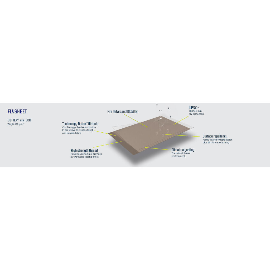 Tältduken är tillverkad i Outtex® Airtech, ett högkvalitativt bomullsblandat material som ger utmärkt ventilation och temperaturreglering. Materialet andas vid värme och isolerar vid kyla, vilket skapar ett behagligt inomhusklimat oavsett väder. Den täta väven gör duken tystare och stabilare än traditionella tältdukar och ger en längre livslängd.
