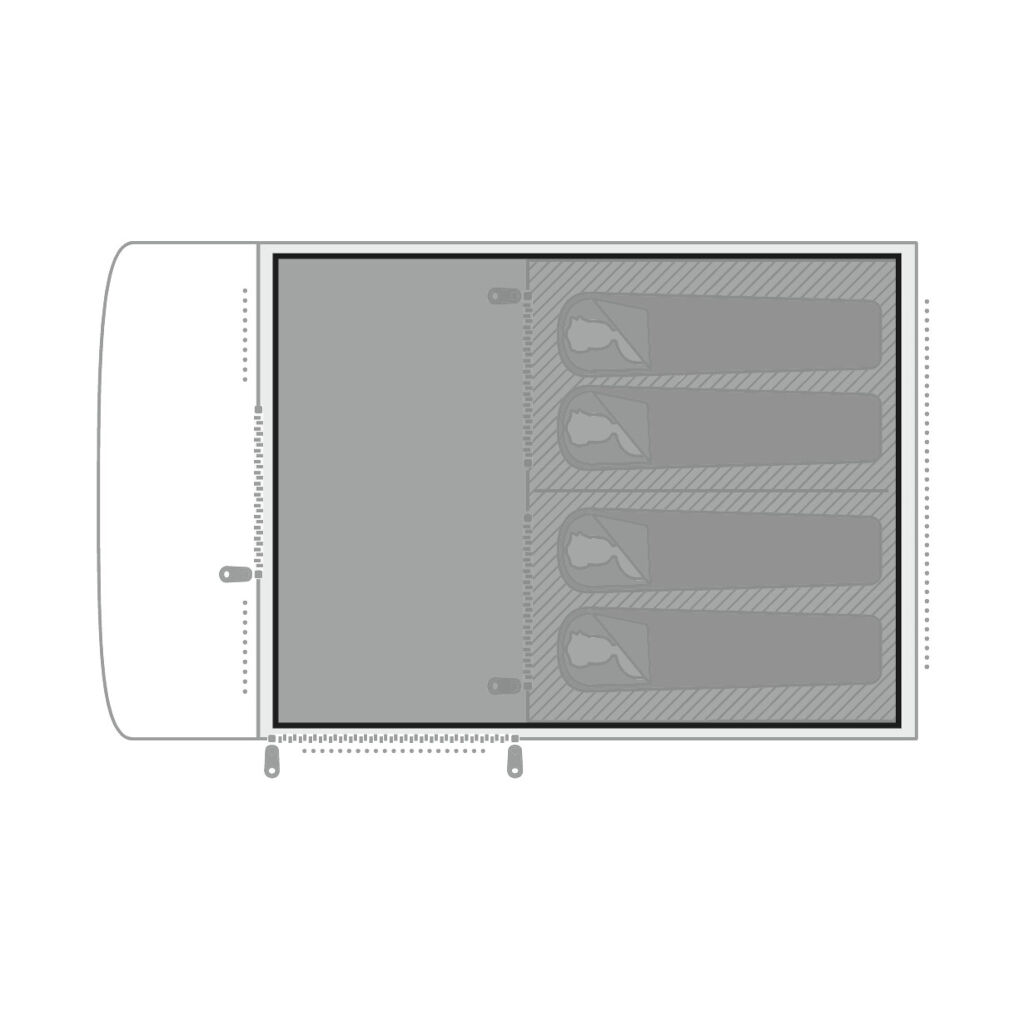 LÄS MERMåttanpassat golvskydd som läggs under familjetältet innan man reser det. Golvskyddet håller tältets golvduk ren och torr samt så minskar det slitaget på den.