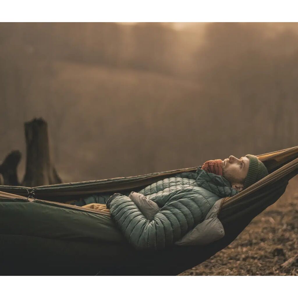 Isolering som hängs under hammocken. Fästs enkelt i hammockens rep/remmar. Dra åt upptill för att spänna isoleringen över kanten på hammocken för maximal värme och komfort.
